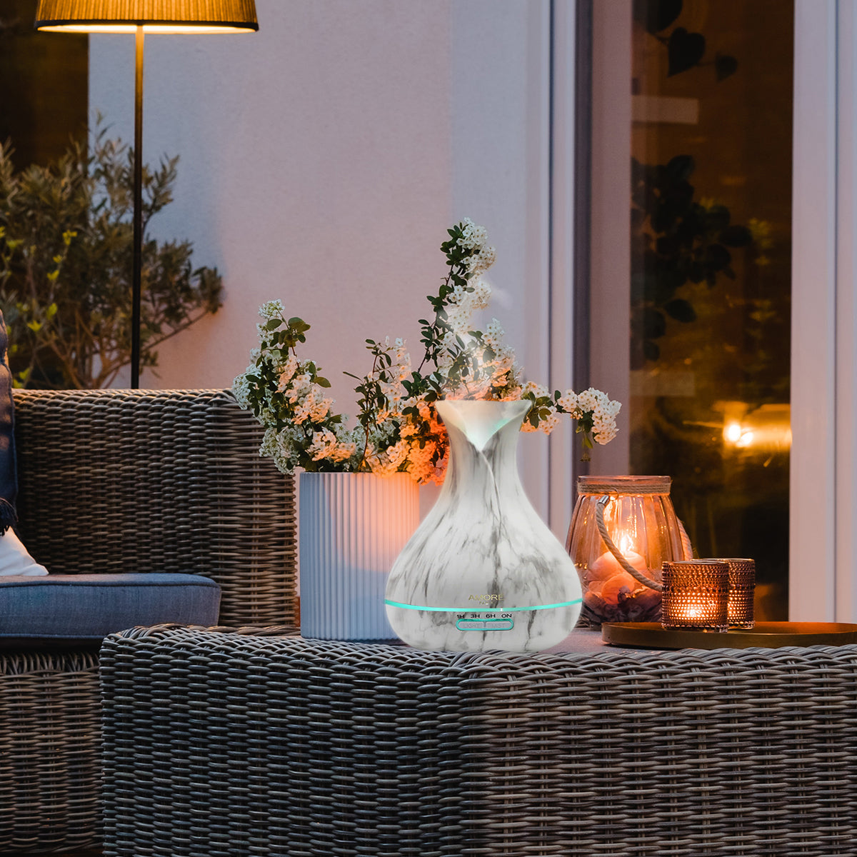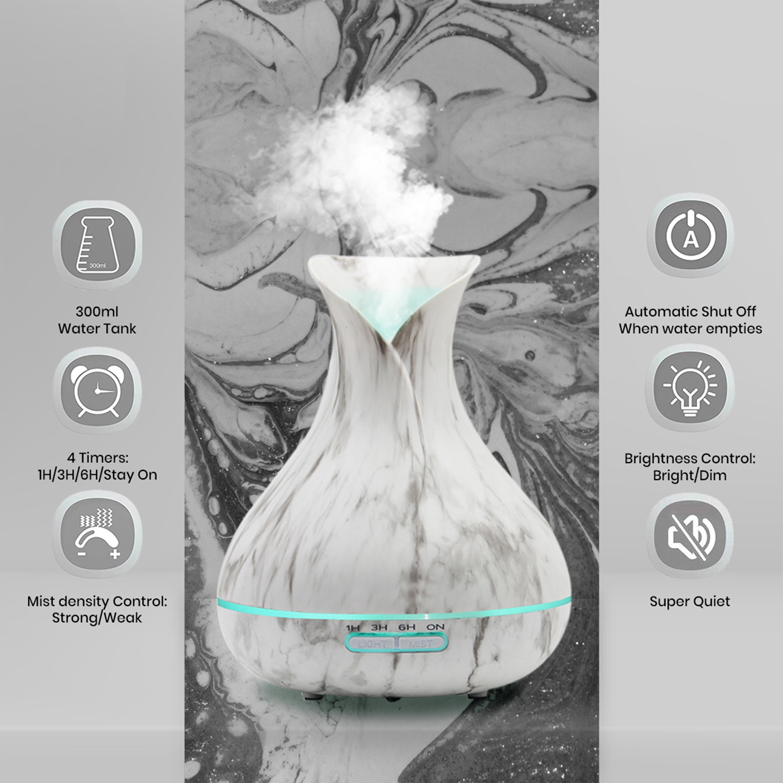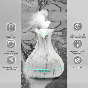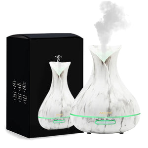Ultrasonic aroma diffuser fills the room with refreshing scents to help you relax and moisturizes dry air. White marble texture flower vase design makes the diffuser high-grade, look beautiful and perfect for any décor. Use it as a decorative piece to create unique scenery or give it as a gift
