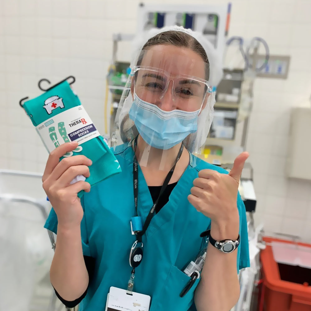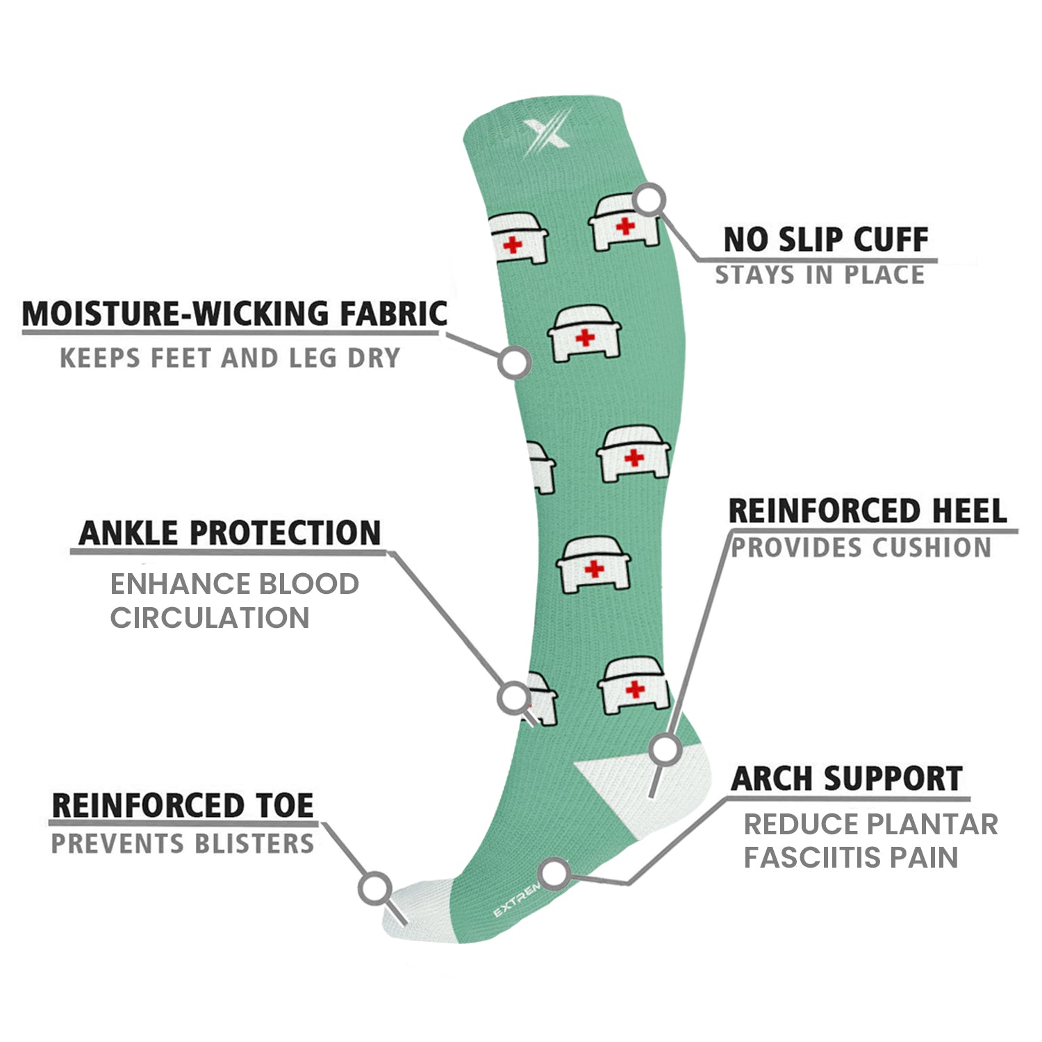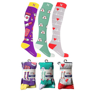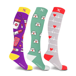 - 3 Pairs of knee-high compression socks with colorful medical prints