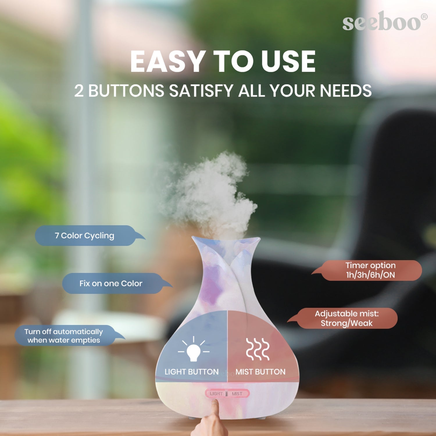 - 7 soothing LED lights to create a calming atmosphere; cycle or steady modes; dim and brighter light options