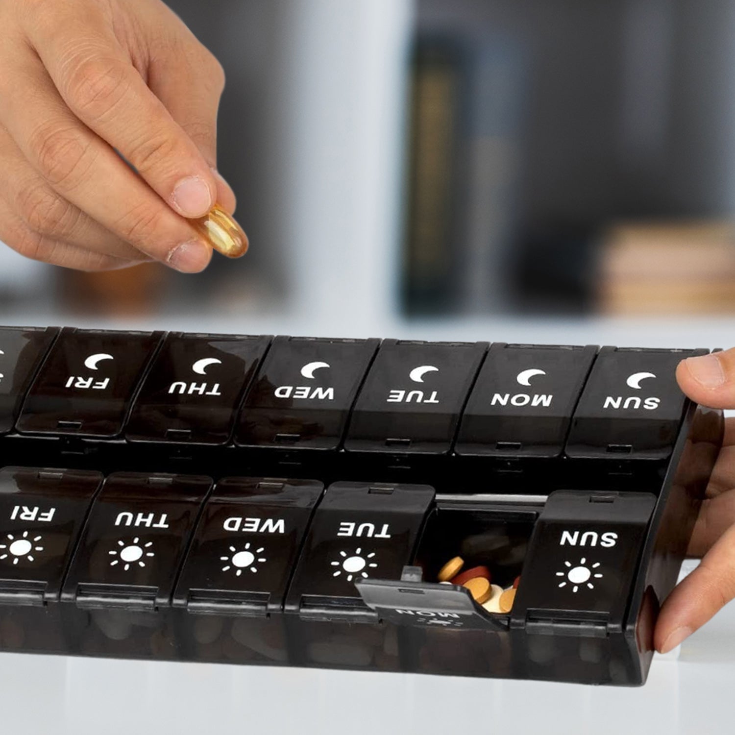 - Each compartment can hold 12 fish oils or 16 large vitamins for daily use.