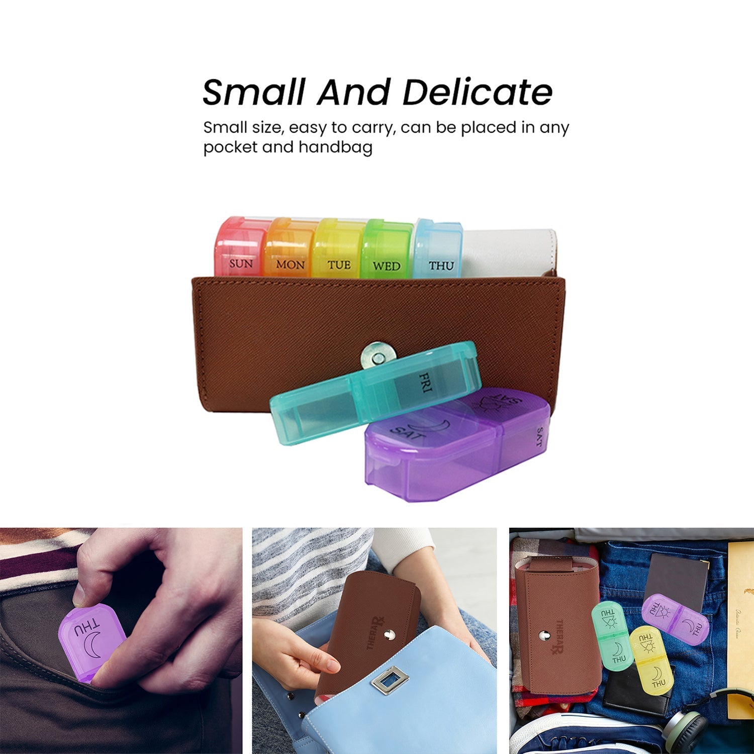 - The PU leather pill organizer case with a bag can protect the pills from light damage, avoid deterioration and provide extra privacy. The unique design makes it easy to carry along with when being on a business trip or traveling.